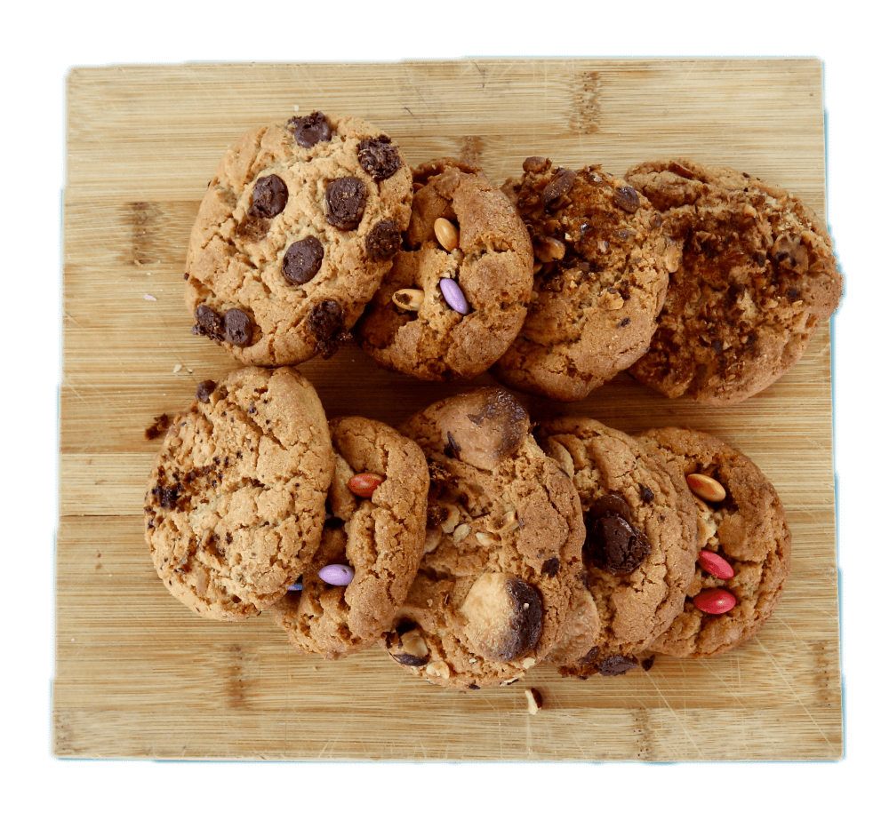 choc chip regular, choc chip gluten free, double choc, snickers, pistachio lemon, pecan cinnamon, white choc & hazelnut